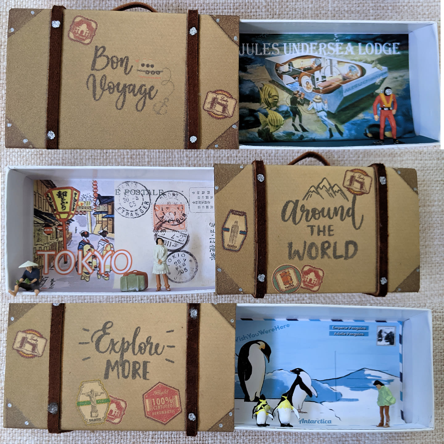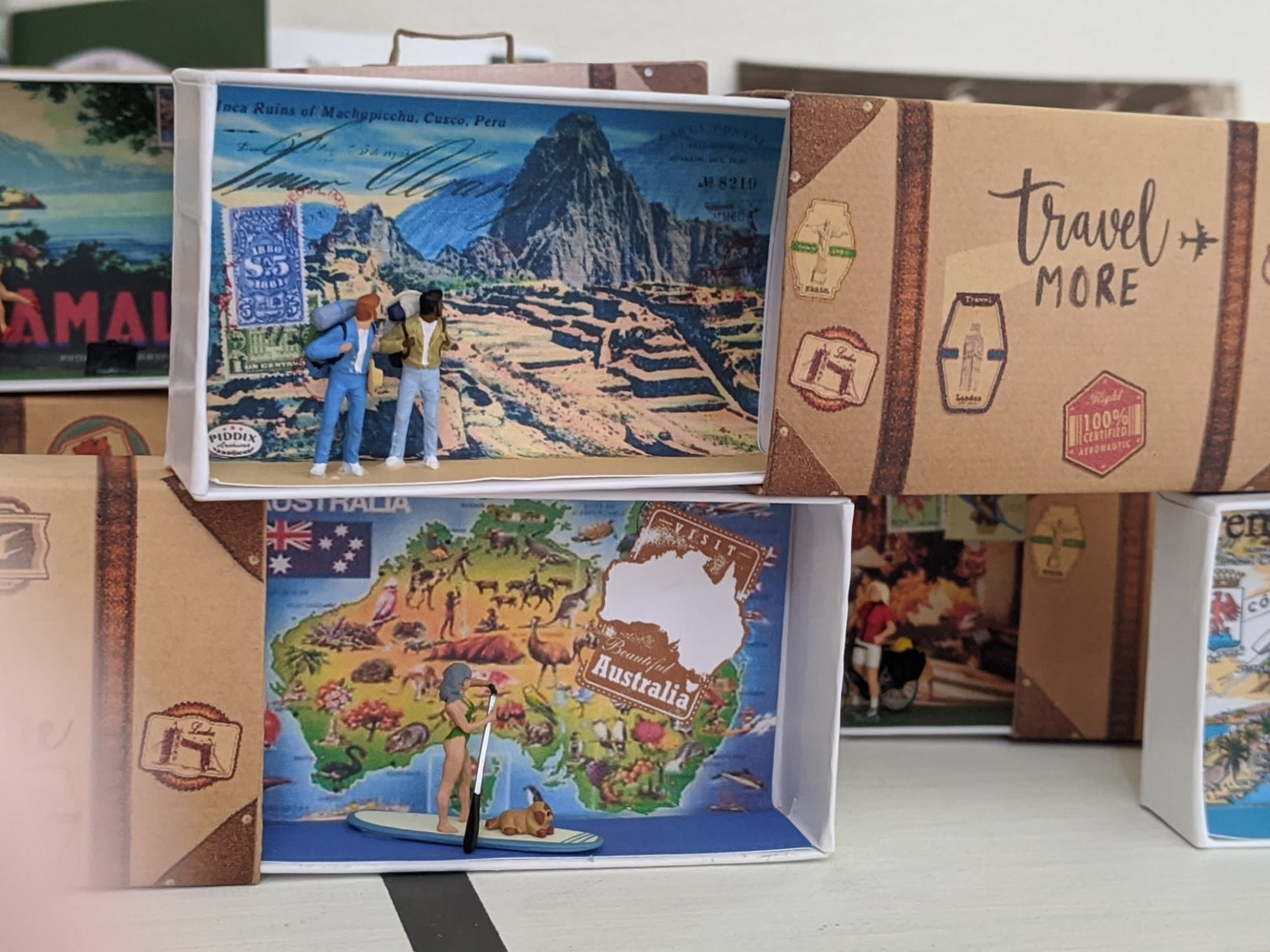 Her first step focused on the travel plans her friends had had to cancel because of Covid. “I took some miniature figures, less than an inch big, and glued them on a globe, just for fun,” she says, “all the places they had planned to go.” When she tired of the globe, she took the figures off and had an acrylic box made to hold them instead. “I made little vintage suitcases from matchboxes and sent them on vacation.” Guth found the miniatures she used (sometimes painting different skin tones and hair colors on them) online from Germany and as far away as Indonesia. Where in the World was the title of the 30-inch by 20-inch piece.