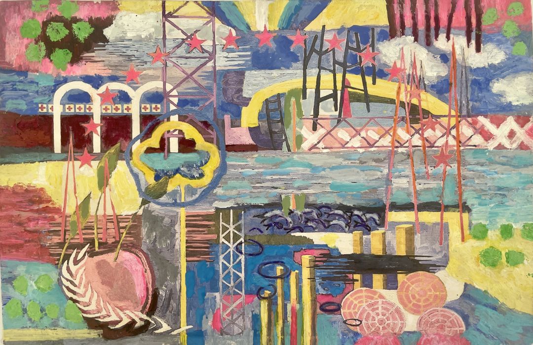 Chapel, the founder of SPAACES, is also working on a personal project called Constructing Utopia. Her submission is derived from a larger 6-foot-by-4-foot canvas. The postcard shows a futuristic city: the tall verticals are buildings and there’s scaffolding and little ocean waves below. "I added elements from flags of countries that have the most poverty and population, many of them had stars. In a utopia, there wouldn't be so much disparity," she says.