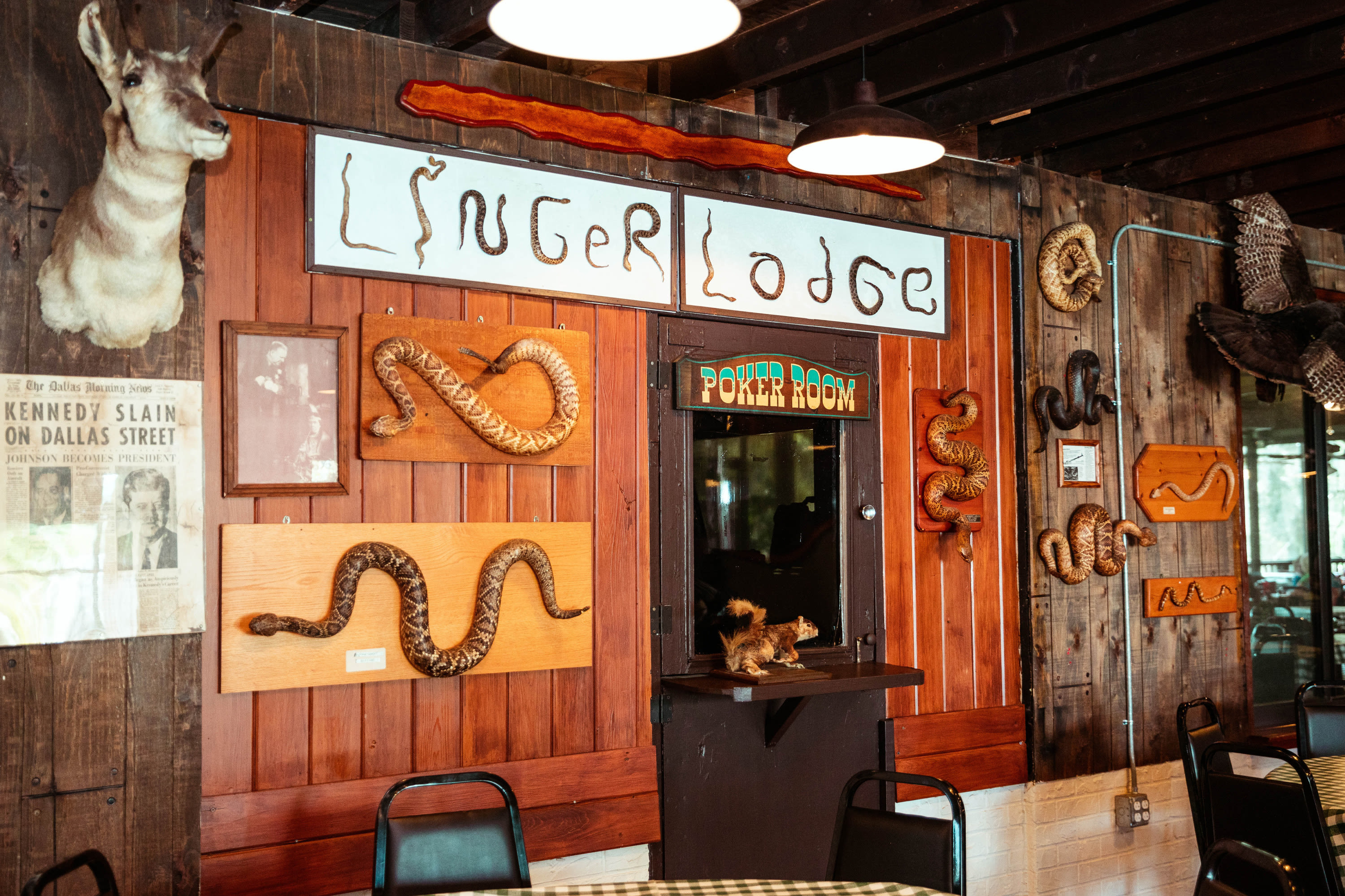 The restaurant, which was named "one of the top five weirdest restaurants in America," by weatherman Al Roker, is exactly that—weird. The walls are adorned with hundreds of taxidermied animals, many of which have been donated by regular patrons.