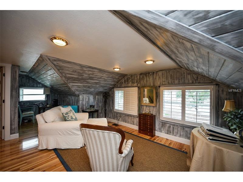 Lots of the original woodwork is still there—the heart pine floors, the beadboard walls and the original staircase, built by a shipbuilder. There are two bedrooms and a bath on the ground floor, and upstairs is an extra-large master suite with several distinct spaces and amazing wood-paneled dormer ceilings.