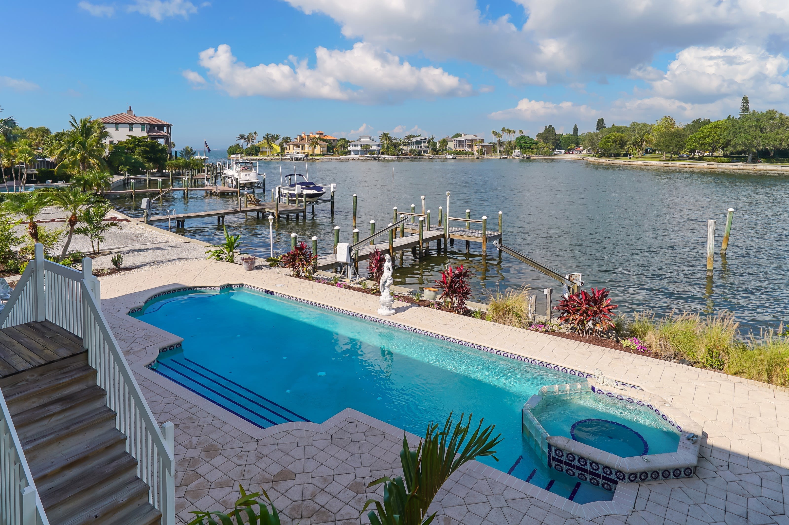 Linda and her husband Bud, a famous NFL coach, bought the place when Bud retired in 1995. It’s very Key West in style, with a covered veranda on all four sides. Facing a good-sized lagoon where the Ringlings used to dock their yachts, it has a dock and a large pool overlooking the water.