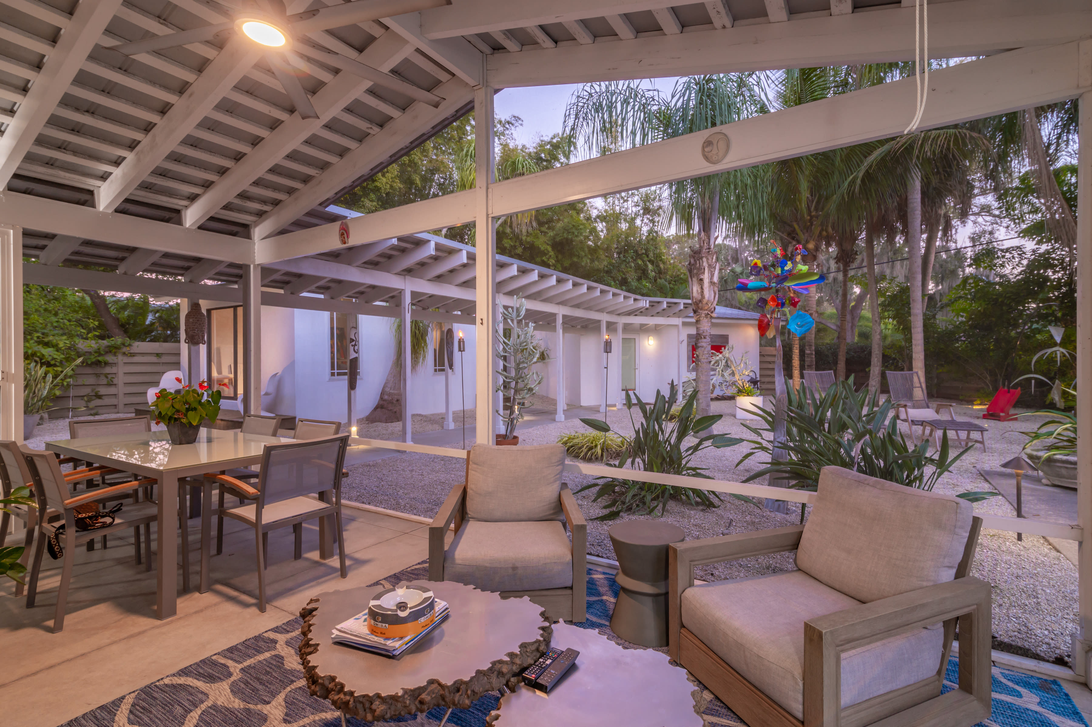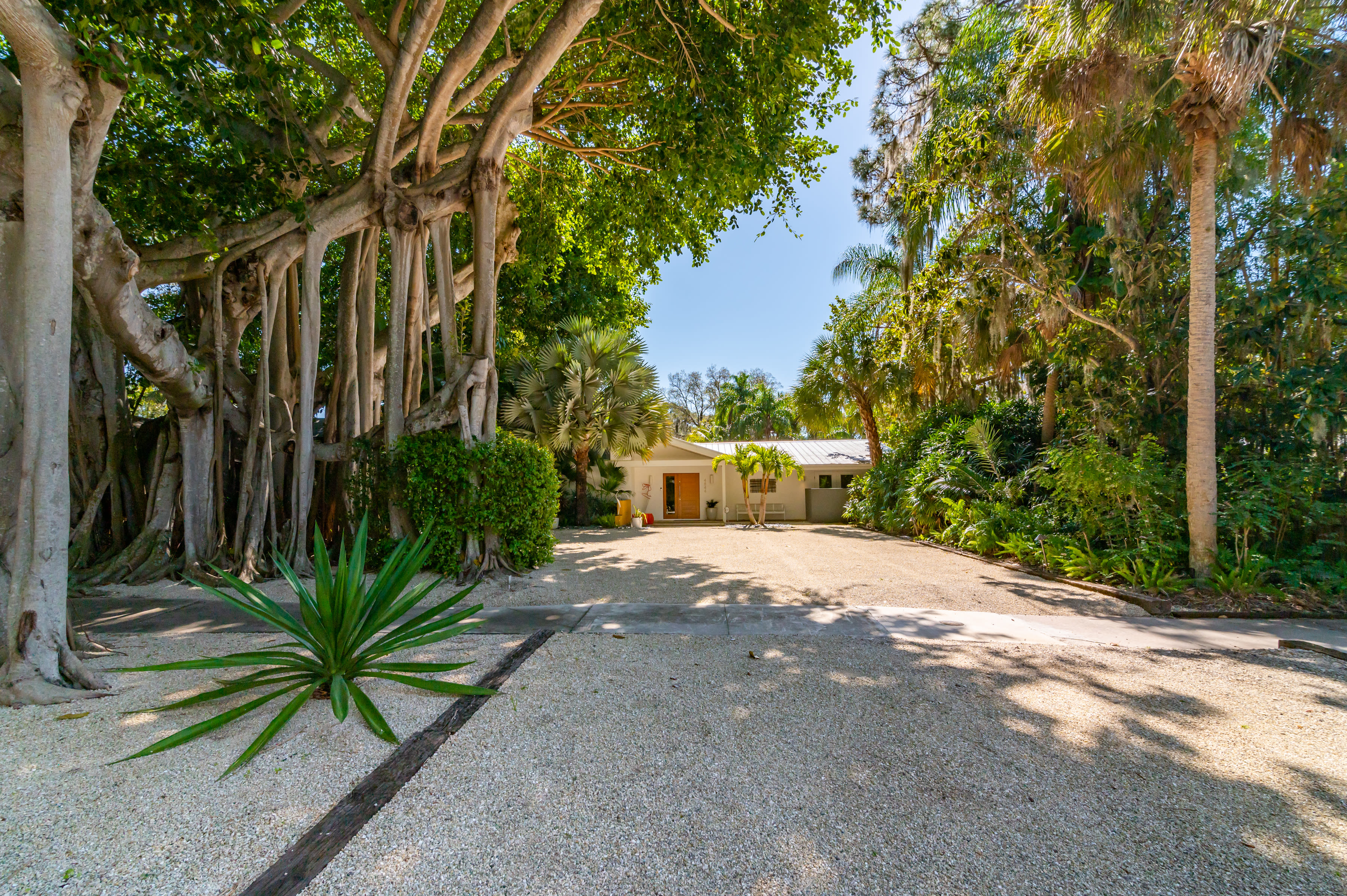 A home in north Sarasota's Sapphire Shores--an eclectic neighborhood of modest ranch homes, 1920s Spanish Mediterranean mansions and ultramodern houses–is on the market for $1.5 million. Renovated in midcentury modern style, the three-bedroom, three-bathroom property includes the main home, a guest cottage and a separate garage. An ancient-looking banyan tree in the front yard offers privacy and a dramatic greeting–and fits right in with the big beautiful oaks in this charming old neighborhood.