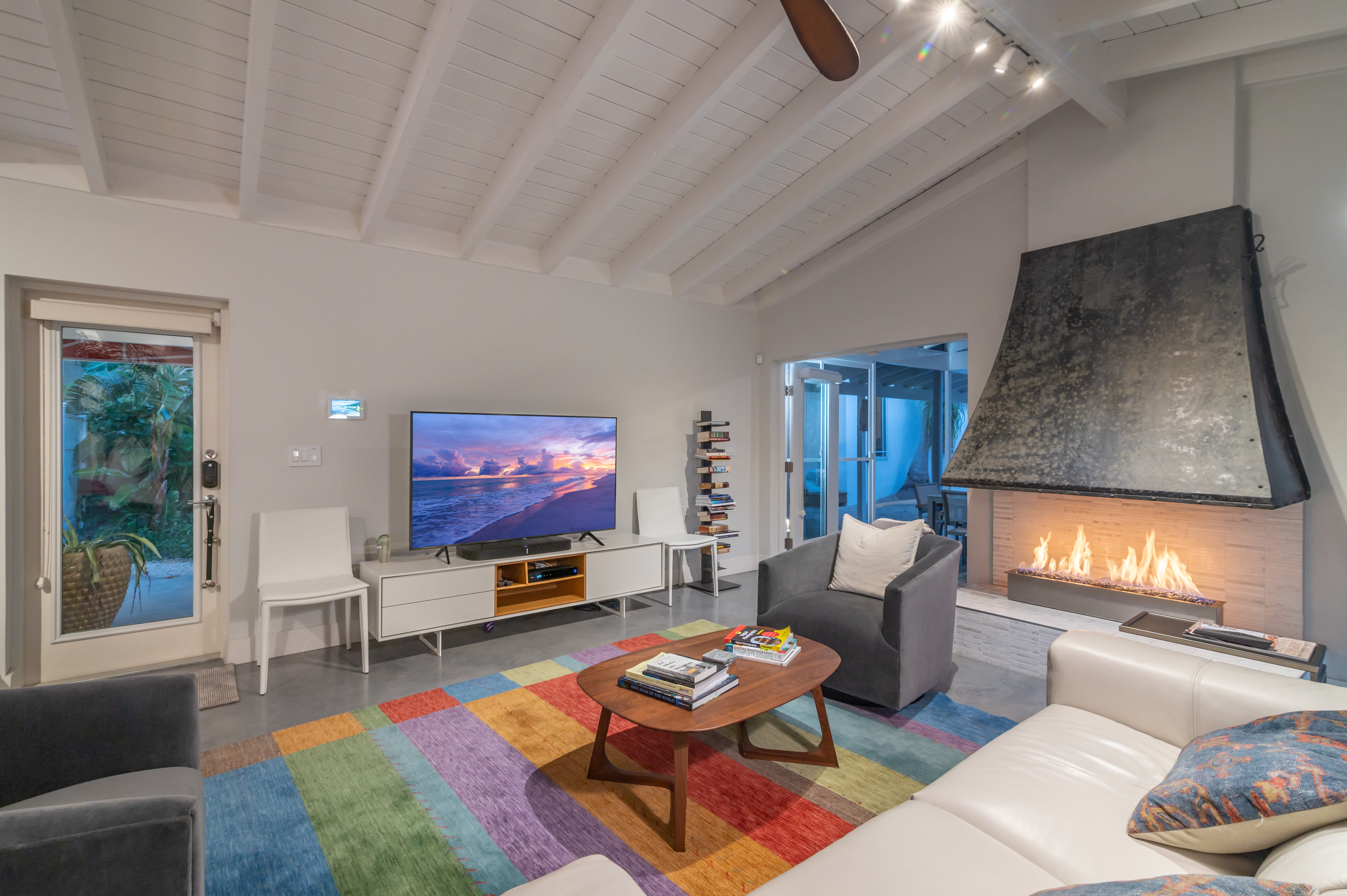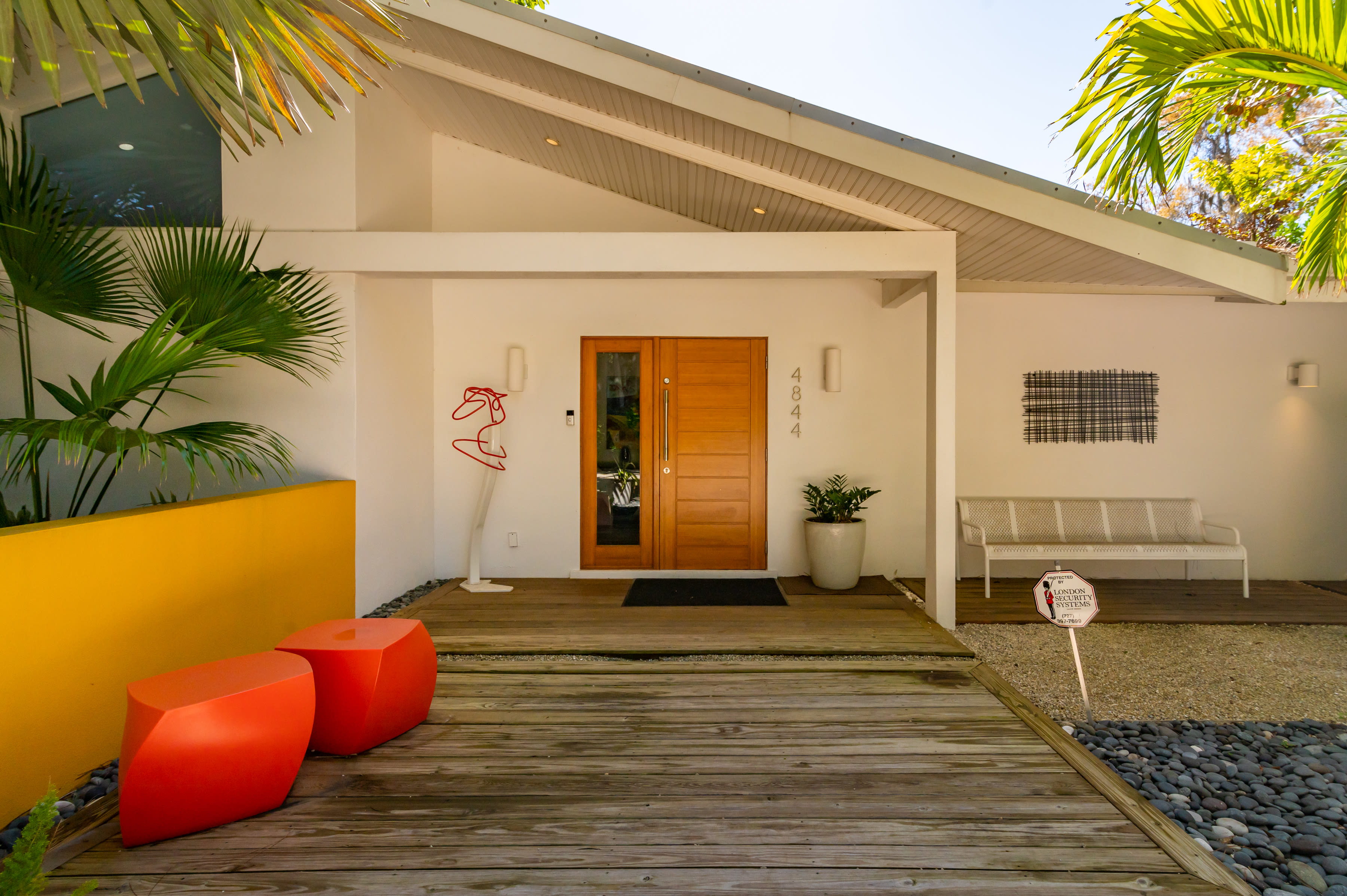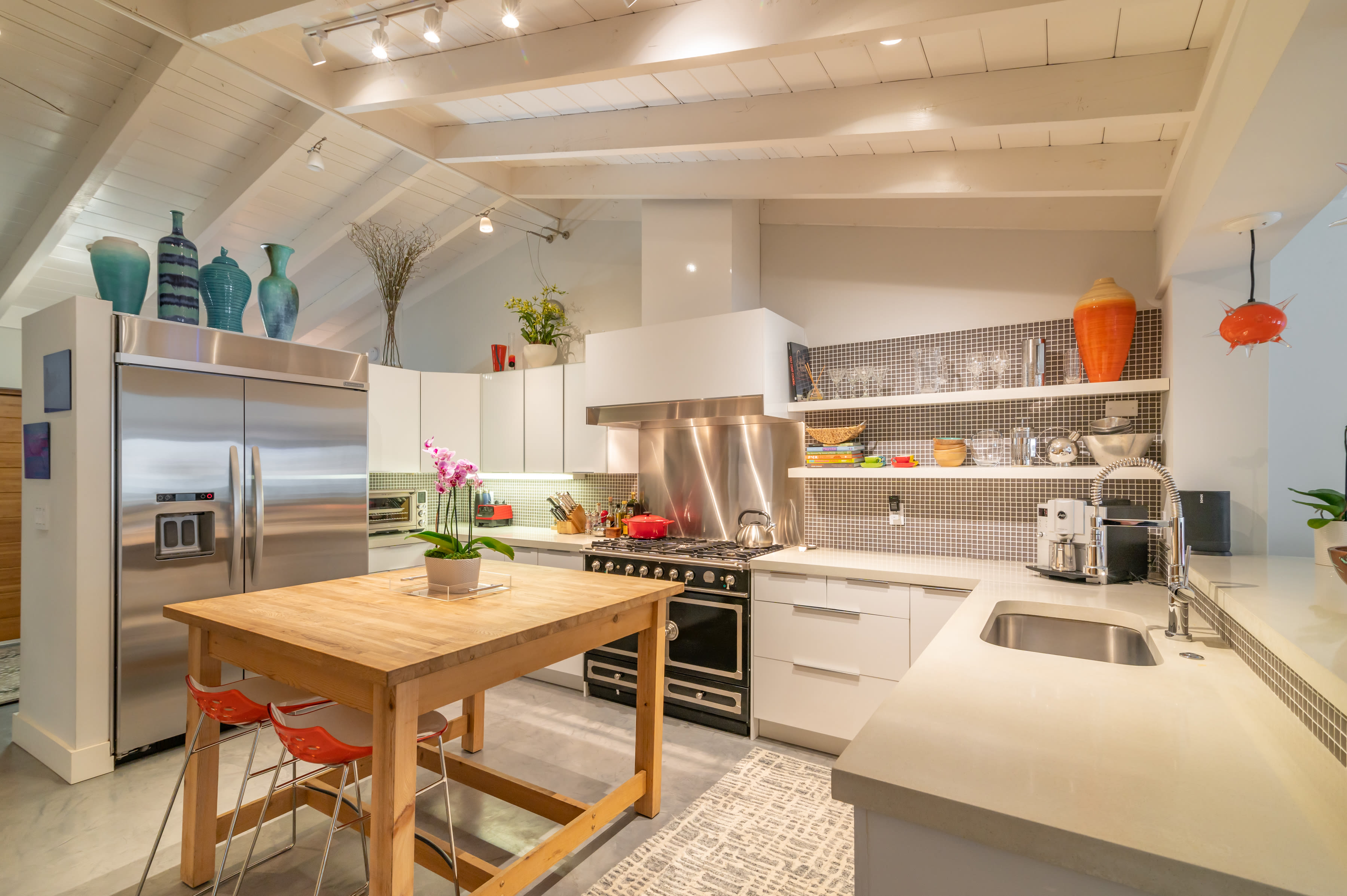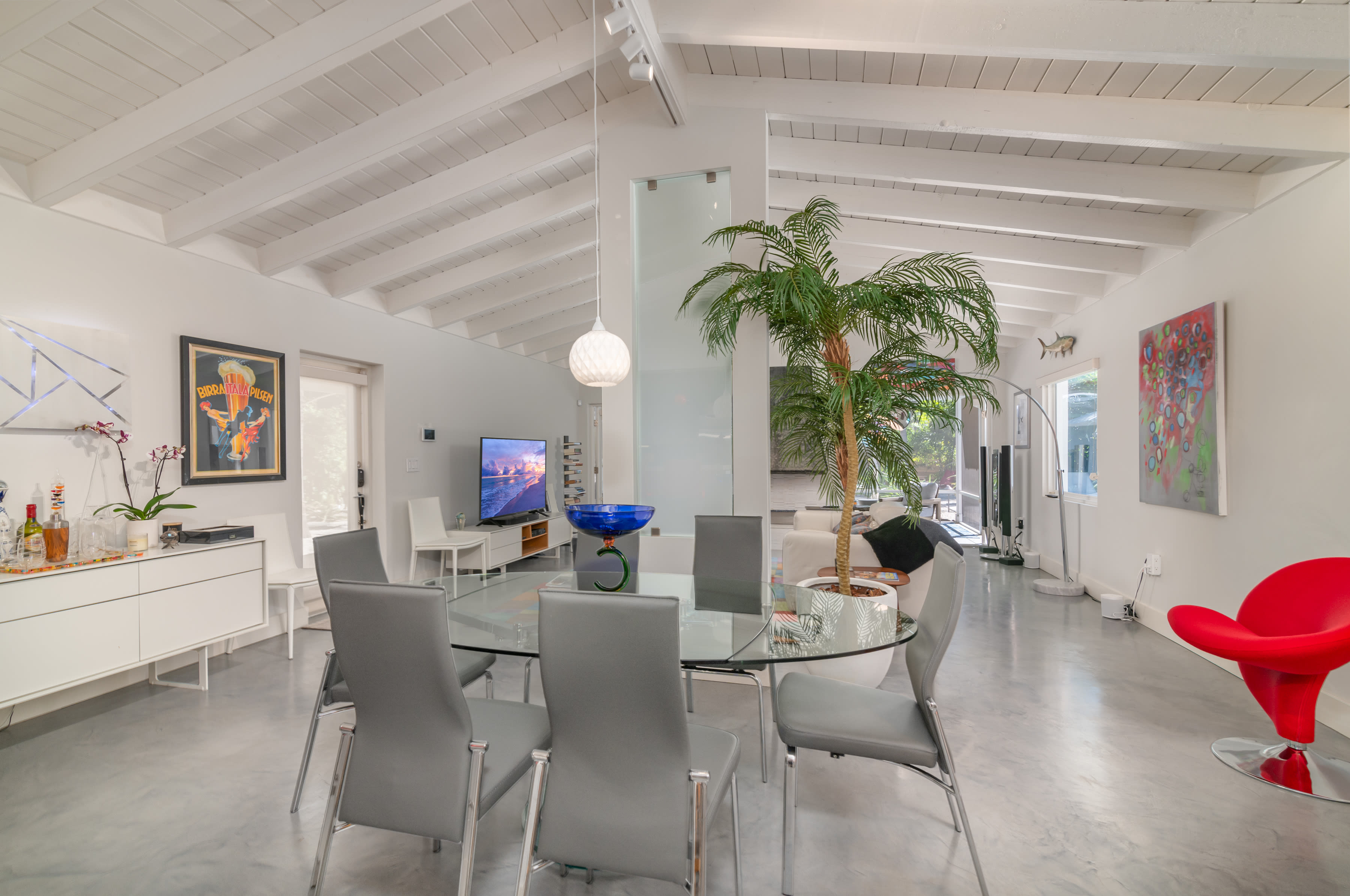 Built in 1957, the home combines retro authenticity with luxury updates, like a solar-heated pool, high-end kitchen appliances, quartz countertops and a gas fireplace. Original elements include bright, white cathedral ceilings with exposed beams and architectural touches like partial walls that add geometric points of interest.