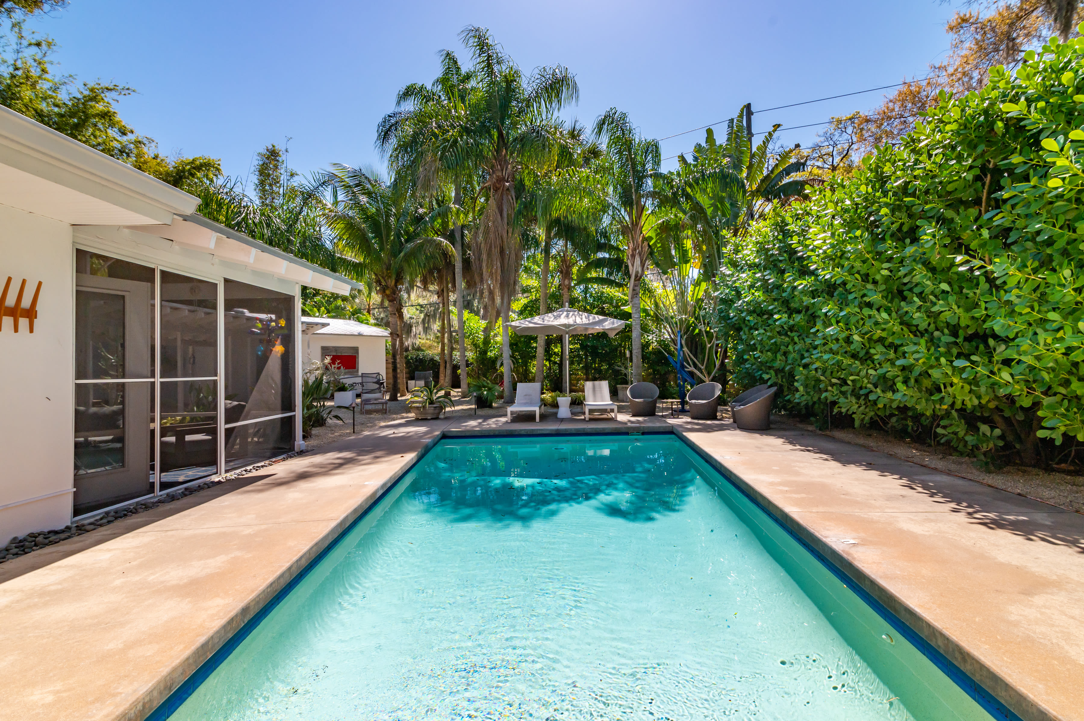 A breezeway leads to the guest cottage; an enormous, screened porch by the pool is an ideal lounge and dining space. Each of the three bedrooms in the main house has direct access to the outdoors, and windows frame lush, tropical landscaping.