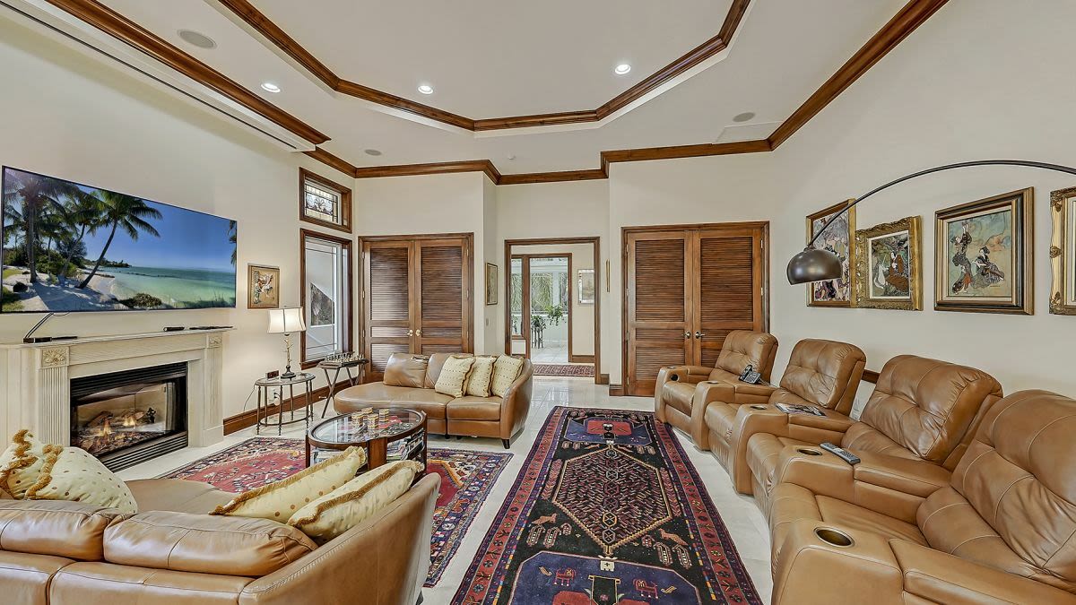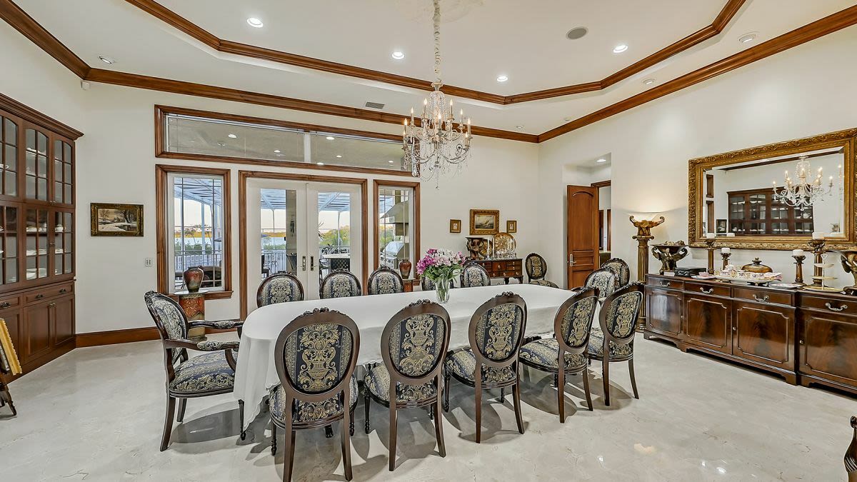 Not so much the exterior, which might best be described a “generic mansion.” But inside, the house takes off. Everywhere you look are leaded glass windows, marble floors, elaborate balustrades, eight fireplaces and a double-walled aquarium.The formal rooms are French-looking, with the enormous living room equal to any hotel lobby. Also check out the game room, the gym, the home theater and, most unusual of all, the vast paneled library that seems to be packed with books—very unusual in a house of this type.