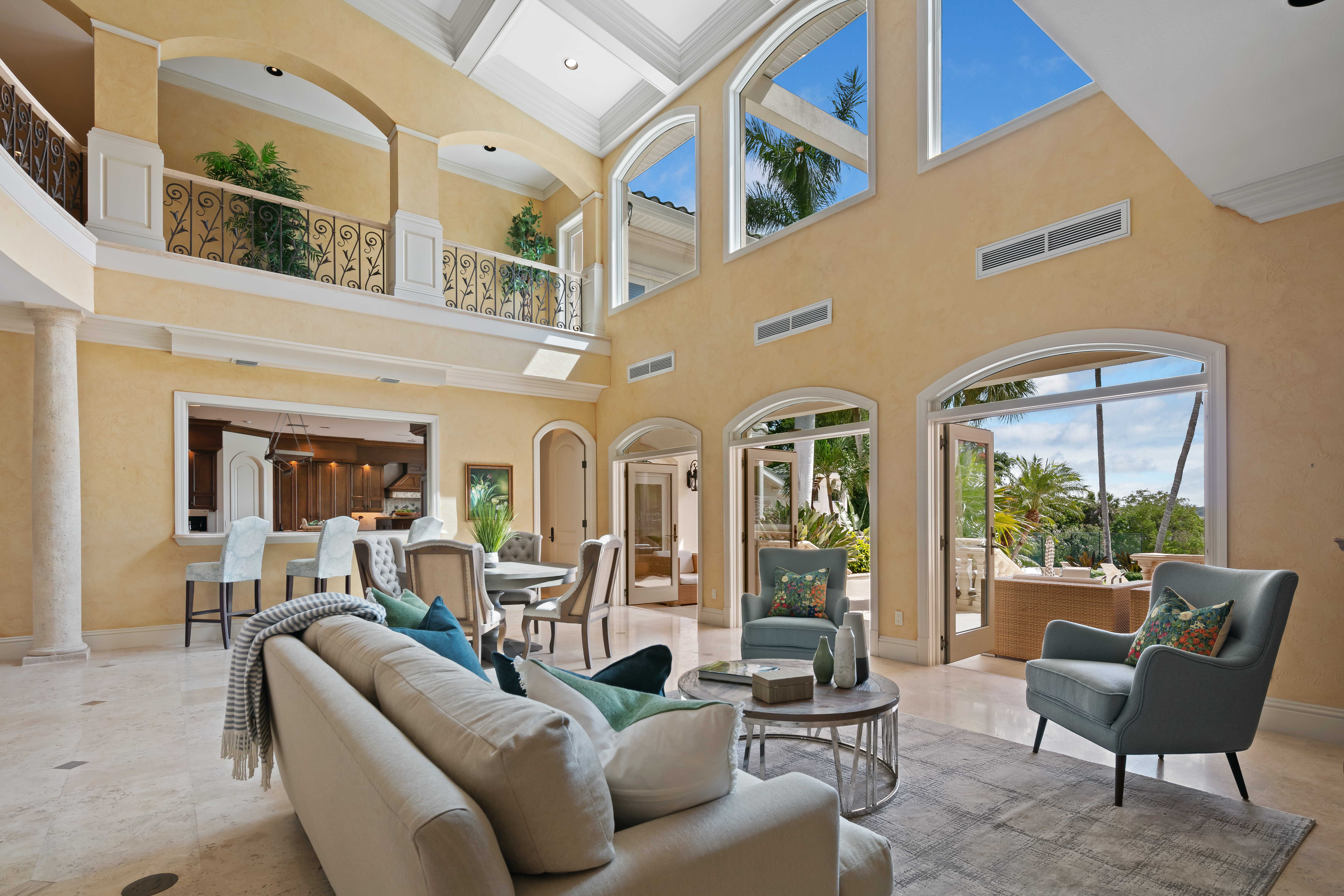 The entryway is downright palatial, with wrought-iron balustrades framing a sweeping double staircase that climbs toward a 26-foot coffered ceiling hung with a grand chandelier. It's so grand we'd feel rude wearing jeans past the threshold.