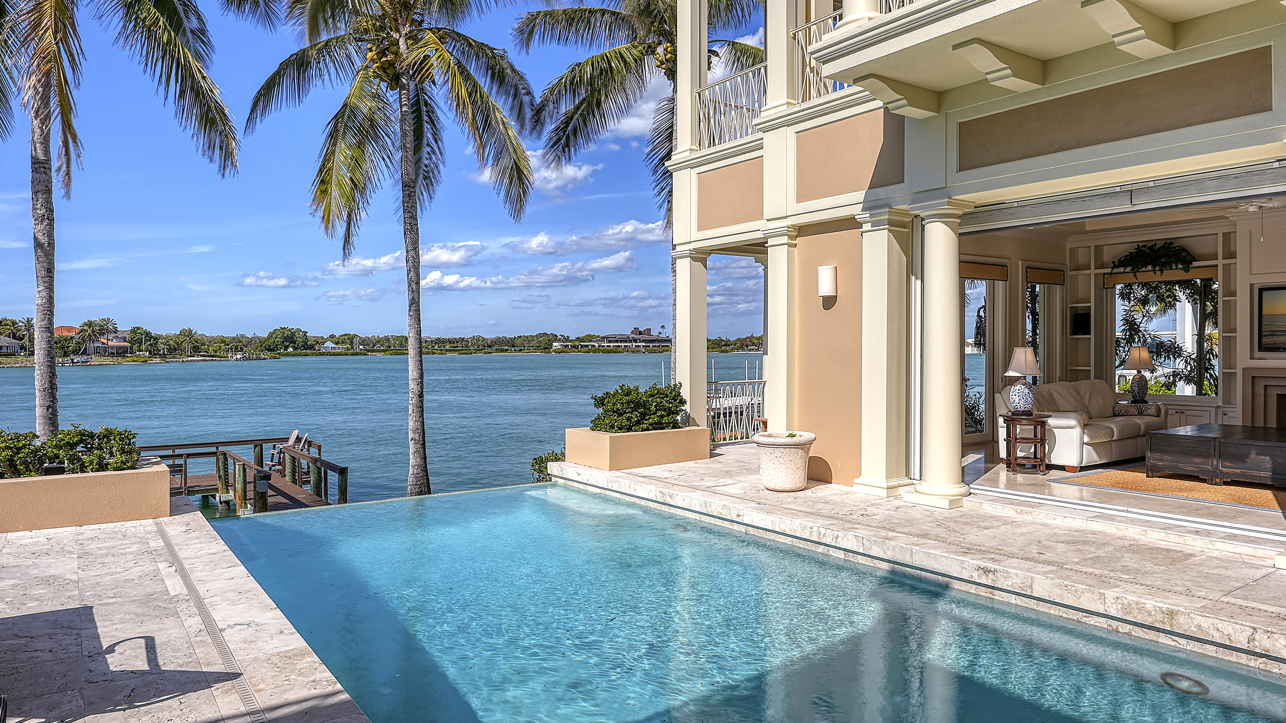 Influenced by time spent in Italy, where she learned about Palladian villas—Roman temple-like homes found in northeast Italy—she created the vision for 1313 Westway Drive. Highlights of the six-bedroom, seven-bathroom home include views of New Pass and the Gulf of Mexico. An outdoor loggia is anchored by a saltwater infinity-edge, heated swimming pool with a waterfall. There’s also a new boat dock, various fruit trees, and close proximity to private beach access.
