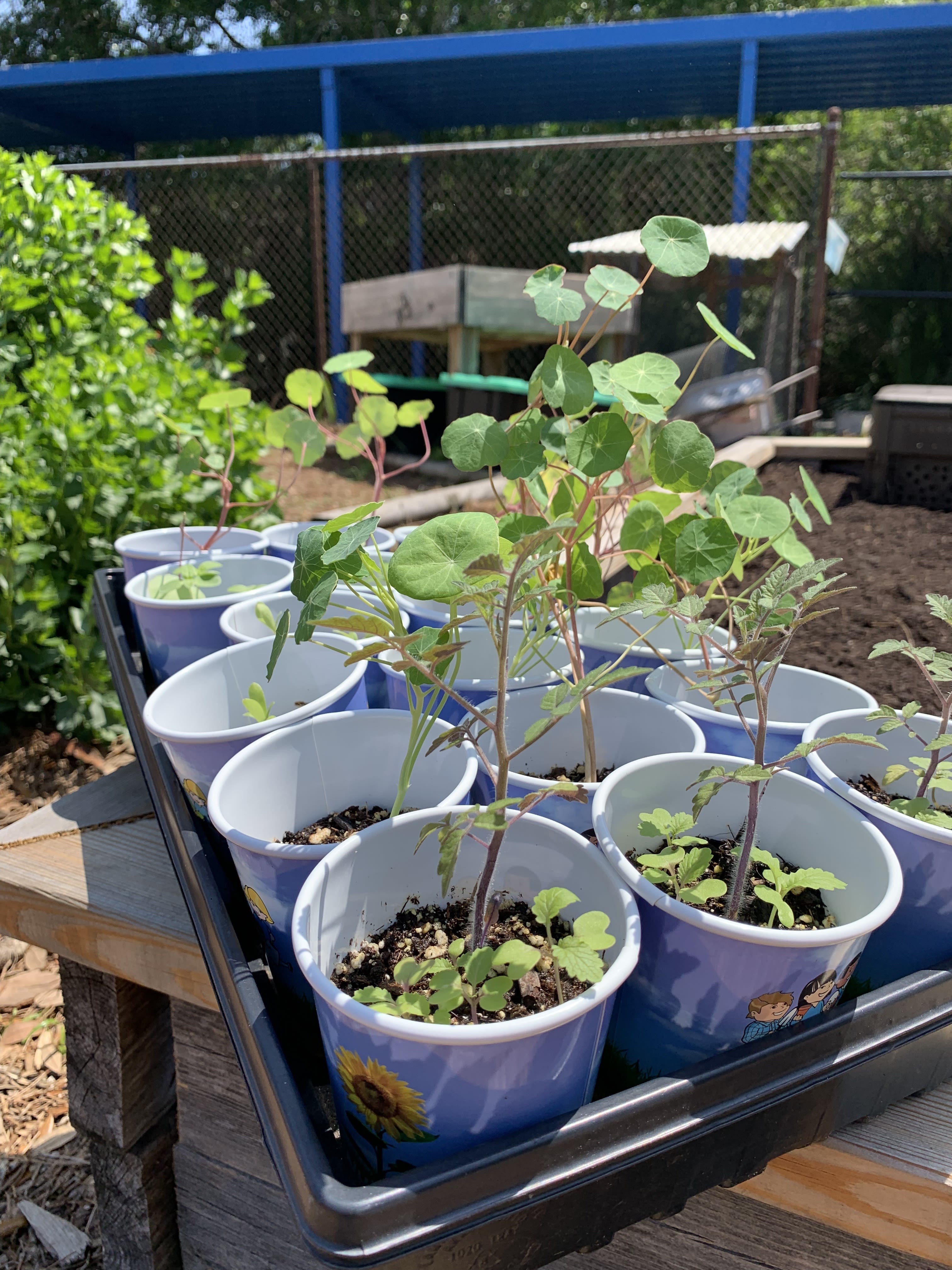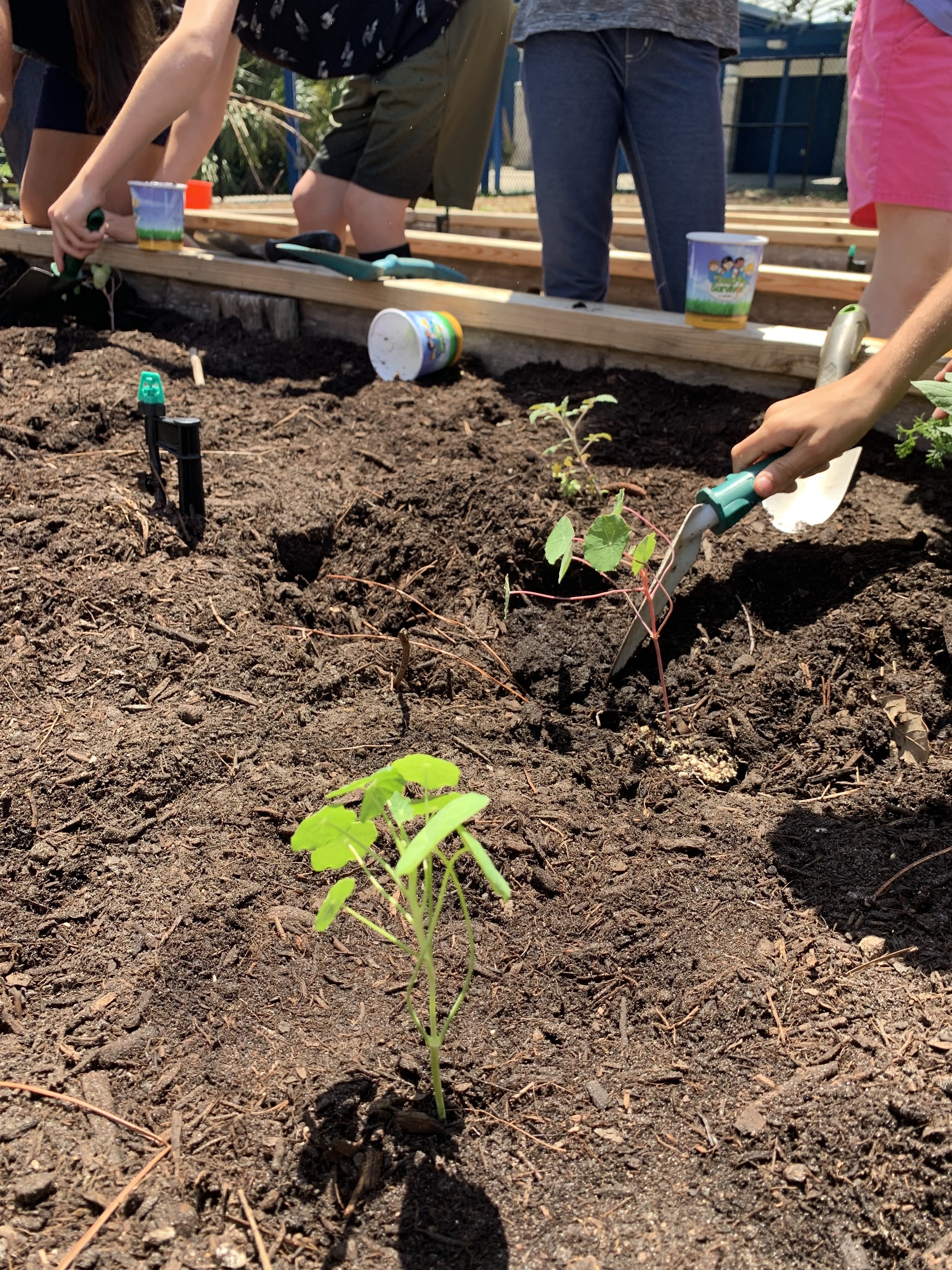 The garden also teaches the students about sustainable practices. Everything you see in it has been repurposed. Food scraps from the school's cafeteria (citrus peels, lettuce heads, strawberries etc.) are collected by students and buried in the soil to enrich it with nutrients. This reduces the school's food waste. The raised soil beds are made of repurposed wood from old school picnic tables.