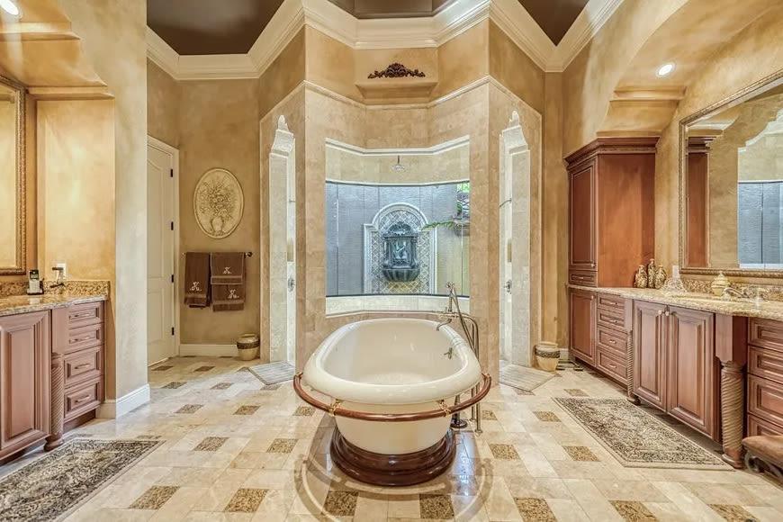 Perched on more than half an acre, there are also five bedrooms and five-and-one-half bathrooms spread across two levels spanning 8,000 square feet, with water views galore. Don't miss the bathrooms, when exemplify the epitome of a bubble bath with a view.